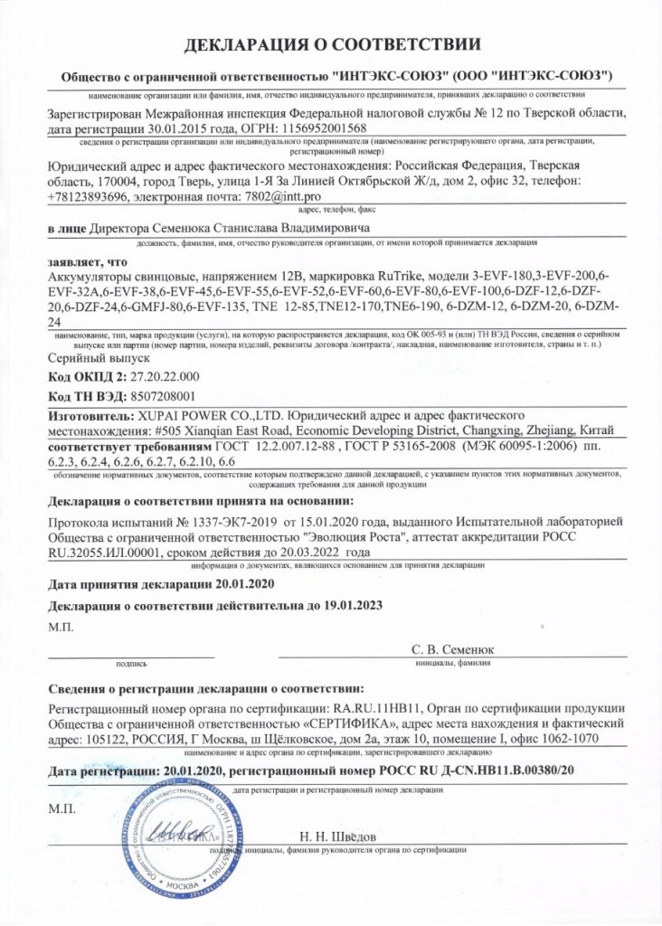Аккумуляторная батарея RuTrike 6-EVF-80 изготовлена по технологии GEL (с гелеобразным кислотным электролитом) имеет длительный срок службы и предназначена для интенсивного использования. Высокая производительность при работе в глубоком цикле. Свинцовые пластины в виде решетки из особого сплава высокого качества, который защищает батарею от коррозии и снижает газовыделение. Специальная свинцовая паста высокой плотности позволяет работать до глубокого разряда, не снижая срок службы аккумулятора. Высокая надежность и безопасность: высокая прочность контейнера и крышки аккумулятора, изготовленных из АБС-пластика, оптимизированная модификация предохранительного клапана, надежные медные клеммы, проводящие ток большой силы – все это служит гарантией высокой надежности и безопасности эксплуатации в экстремальных условиях.